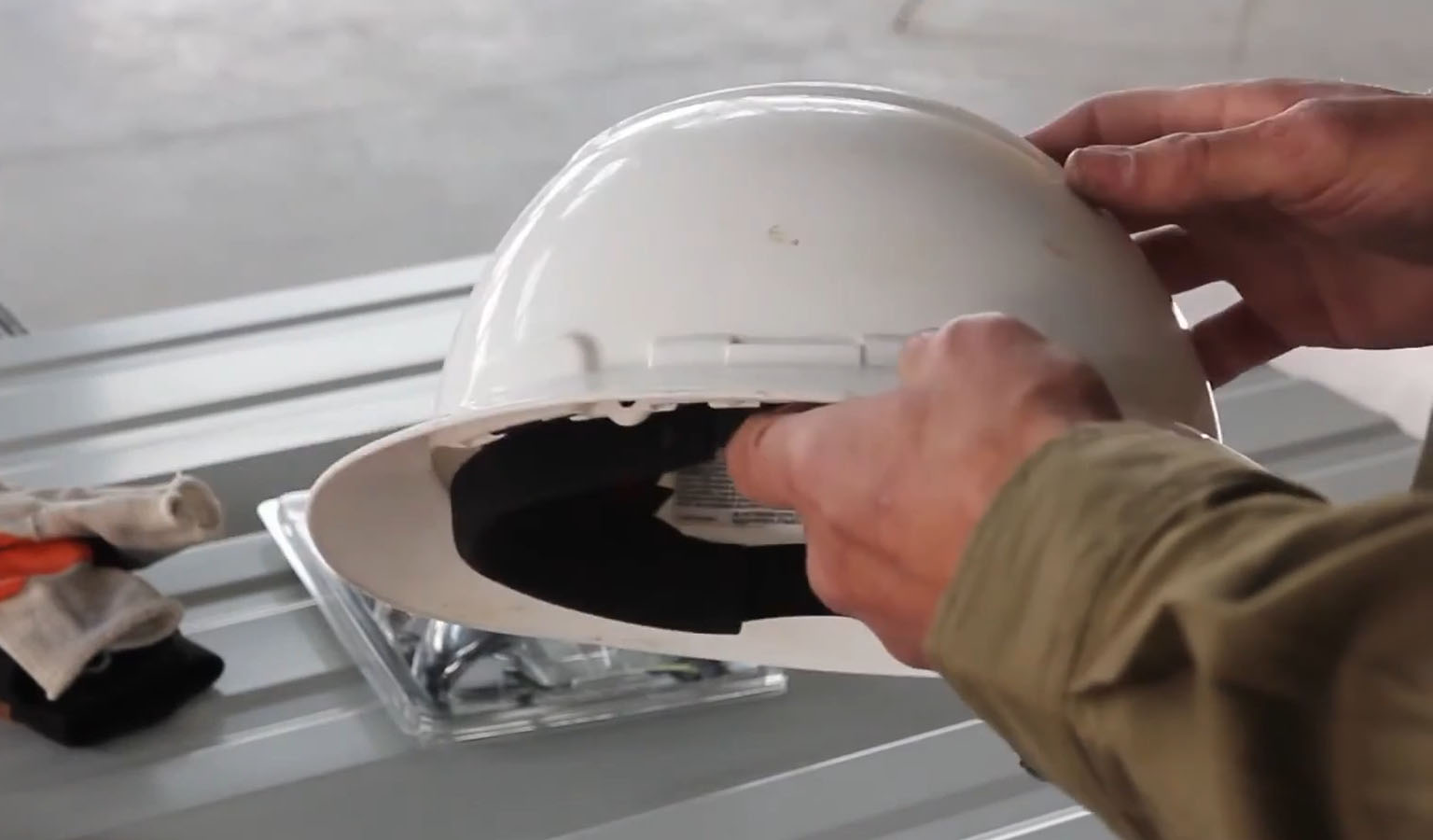 For head protection, a hard hat is highly recommended. You’ll especially want a hard hat when you’re flying beams and rafters into place.
